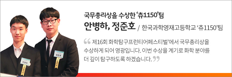 ▲ (좌측부터) 제16회 화학탐구프런티어페스티벌 국무총리상 수상팀 ‘츄1150’팀과 산업통상자원부 장관상 ’뽑아쥬셰엽’팀, 교육부 장관상 ’깊은혜윰’팀