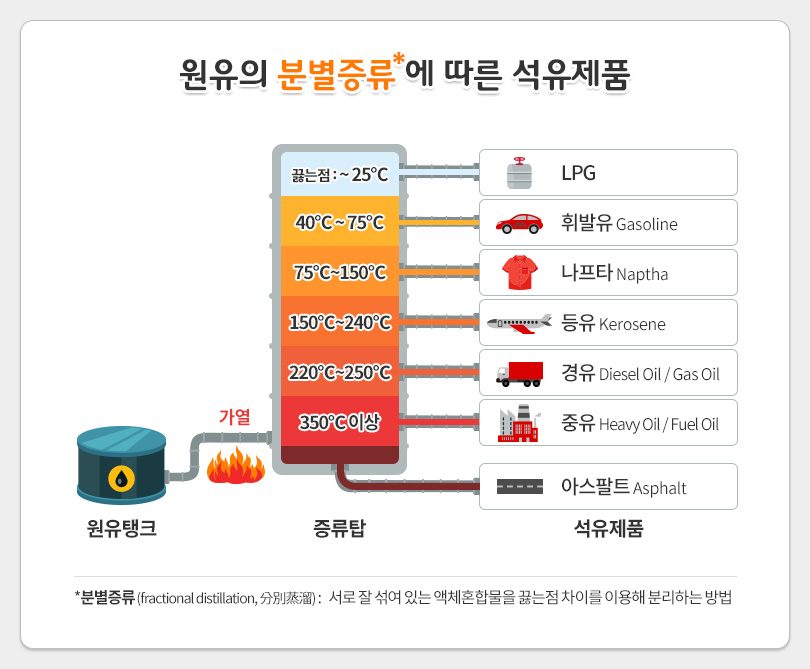 주유소에서 흔히 볼 수 있는 휘발유, 등유, 경유, 그리고 LPG는 모두 ‘원유’를 분별 증류해 생산된다. 상압증류탑 (Crude Distillation Unit, CDU)에서 분별 증류되는 석유제품들은 끓는 점에 의해 가장 가벼운 성분인 LPG부터 가장 무거운 잔류물인 아스팔트까지 다양한 제품으로 분리된다. 각기 다른 특색을 가진 주유소의 석유제품들을 지금 만나 보자.
