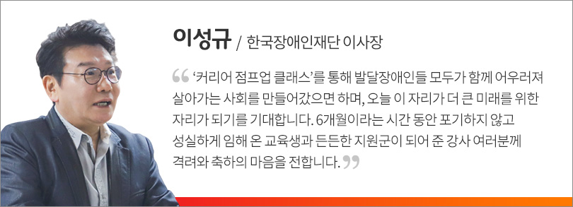 ‘커리어 점프업 클래스’ 2기 수료식에는 한국장애인고용공단 정정식 기획관리이사, 한국장애인재단 이성규 이사장, SK이노베이션 홍보실 박현섭 PL, 강사 및 수료생 등 관계자 70여 명이 참석했다.