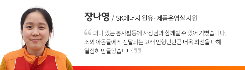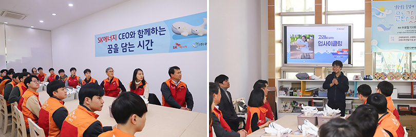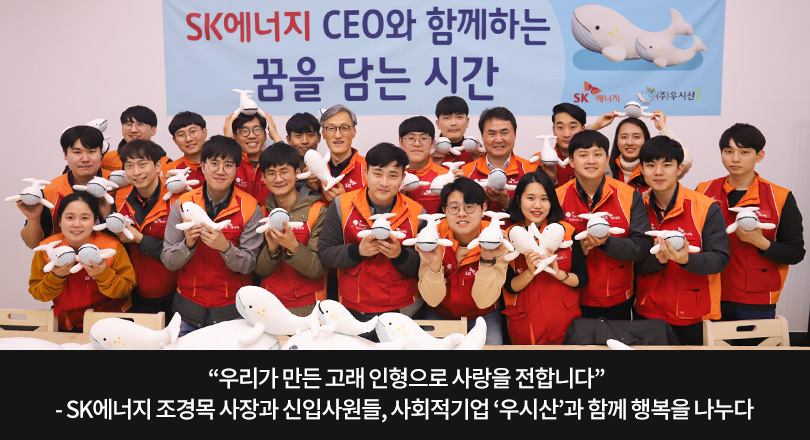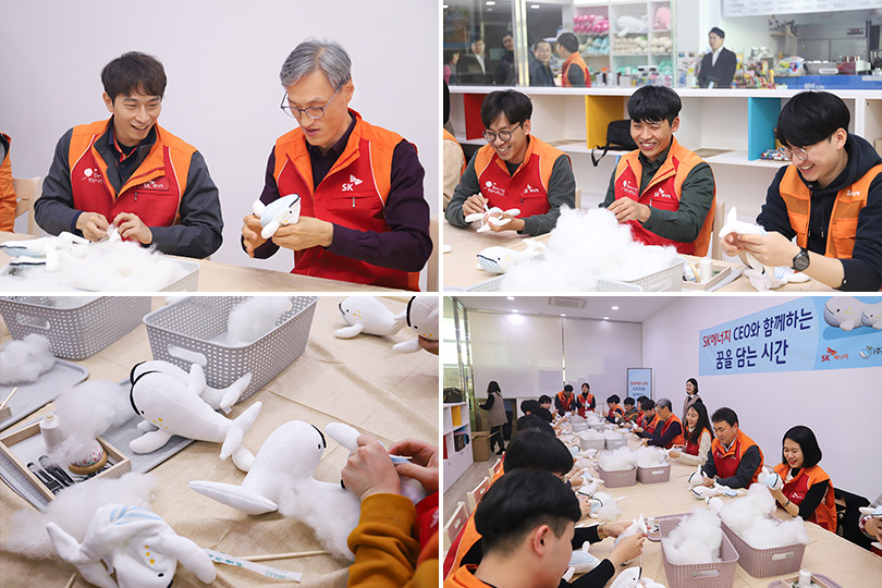 SK에너지 신입사원 19명과 조경목 사장은 11월 20일, 울산 장생포 고래박물관에서 사회적기업 ‘우시산’이 제작, 판매 중인 고래 인형을 직접 만드는 봉사활동을 함께했다.