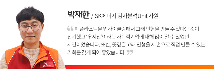 SK이노베이션이 육성 지원하는 사회적기업 ‘우시산’은 해양 폐플라스틱을 업사이클링*해 고래 인형, 에코백, 티셔츠 등 친환경 제품을 만들어 판매하고 있다. ‘우시산’은 폐플라스틱 업사이클링을 위해 울산항만공사 및 울산 지역에 위치한 10여 곳의 수거 업체와 제휴, 대형 선박들이 배출한 폐플라스틱을 수거하고 있다. 또, 지역 내 자원 재활용 전문 사회적기업과도 제휴를 맺어 수거된 페트병을 압축 및 세척한 후 이를 다시 전문 업체로 보내 재생 솜과 원단으로 변환하는 프로세스를 구축한 바 있다.