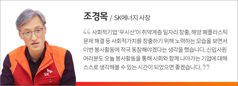 뒤이어 조경목 사장은 우시산의 사회적가치 창출 활동에 대한 감명을 드러내며, 봉사활동에 참여한 신입사원들에게 특별한 메시지를 전했다.