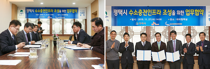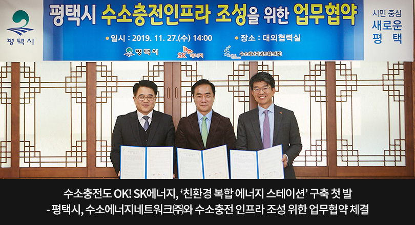 SK에너지는 11월 27일, 평택시 및 수소에너지네트워크㈜(이하 하이넷)와 ‘평택시 수소충전 인프라 조성’을 위한 업무협약을 체결했다.
