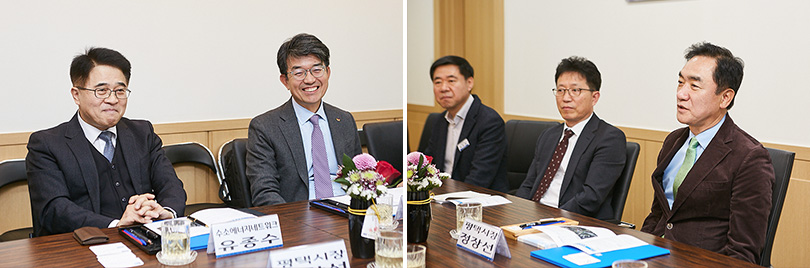 ▲ 11월 27일, 경기도 평택시청에서 열린 ‘평택시 수소충전인프라 조성을 위한 업무협약식’에 참석한 (좌측 사진 중 왼쪽에서 첫 번째) 하이넷 유종슈 대표와 (좌측 사진 중 왼쪽에서 두 번째) SK에너지 심두섭 B2C사업본부장, 정장선 평택시장 (우측 사진 중 오른쪽에서 첫 번째)