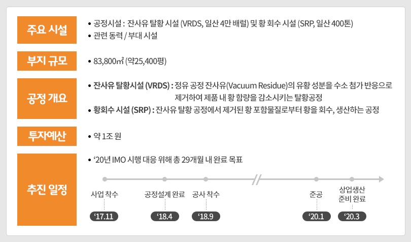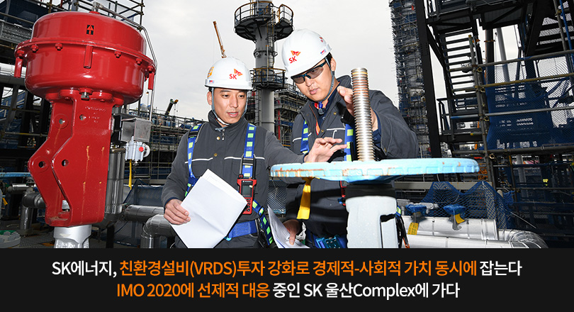 이에 SK에너지는 지난 2017년 11월, 약 1조원 투입을 통해 SK울산 Complex 내에 감압잔사유 탈황설비(Vacuum Residue Desulfurization, 이하 VRDS) 건설에 돌입했다. VRDS는 고유황 중질유를 원료로 0.5% 저유황 중질유(Low sulfur Fuel Oil), 선박용 경유(Marine Gas Oil) 등 하루 총 4만 배럴의 저유황유를 생산할 수 있어 IMO2020에 대응하는 가장 효과적인 설비*다.