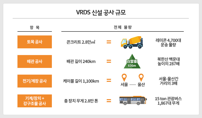 VRDS는 지난 2008년 약 2조 원을 투자해 가동을 시작한 제2고도화설비(FCC, Fluidized Catalytic Cracking, 중질유 촉매분해공정) 이후 SK에너지 최대 석유사업 프로젝트다. 실제로 VRDS는 설비를 연결하는 배관 길이만 총 240km로 북한산 백운대 높이의 287배에 달하며 토목 공사를 위한 콘크리트 부피도 2만 8천㎥에 이른다. 전기, 계장 공사에 들어간 케이블 길이도 서울-울산간 거리의 3배이며 설치된 장치들의 총 무게도 15t 관광버스 1,867대의 무게에 달하는 대규모 공사다.