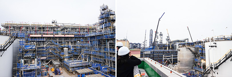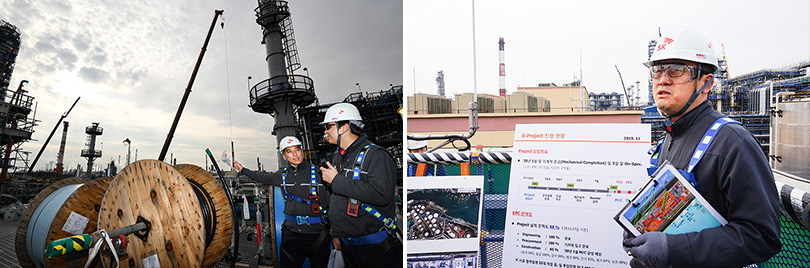 11월 27일, SK 울산CLX 내 VRDS 공사현장은 전체 공정에서 가장 큰 설비인 반응기(Reactor)에 연관 공정을 연결하는 배관작업과 계기 및 보온재 설치 등 막바지 작업으로 분주했다. 현장은 다양한 설비 및 배관들이 질서정연하게 배치되어 있었다. 그 사이사이 구슬땀을 흘리며 열심히 일하는 작업자들의 모습도 눈에 띄었다.