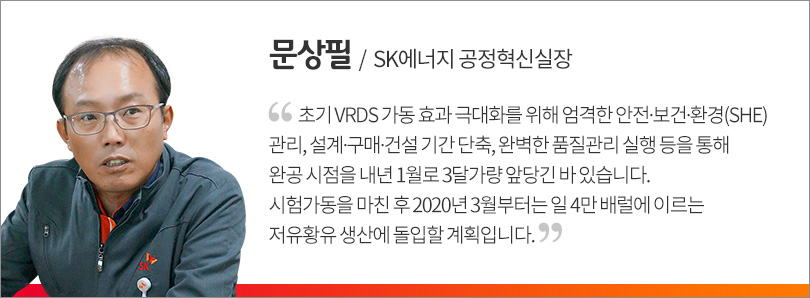 SK에너지는 초기 VRDS 가동 효과 극대화를 위해 ▲엄격한 안전·보건·환경(SHE) 관리, ▲설계/구매/건설 기간 단축, ▲완벽한 품질관리 실행 등을 통해 완공 시점을 내년 1월로 3달 가량 앞당겼다. 시험가동을 마친 후 내년 3월부터는 일 4만 배럴에 이르는 저유황유 생산에 돌입할 계획이다.