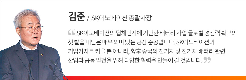 ▲ 중국 장쑤성 창저우시에서 진행된 SK이노베이션의 첫 글로벌 배터리 셀 생산 공장 ‘BEST’ 준공식에서 김준 총괄사장이 축사를 하고 있다.