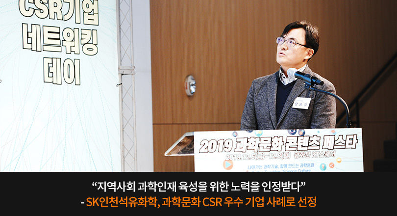 SK인천석유화학이 12월 6일부터 8일까지 서울 광화문에서 진행된 ‘2019 과학문화 콘텐츠 페스타’에서 ‘과학문화 CSR*기업 네트워킹 우수 사례’로 선정돼 사례 발표를 진행했다.