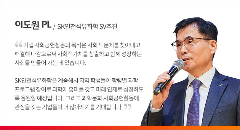 SK인천석유화학은 인천지역 미래인재 육성의 지속성과 효과성 담보를 위해 2008년부터 과학기술을 활용한 교육 분야 사회공헌 프로그램을 진행해오고 있다. 교육분야 전문가, 학부모, 컨설팅 기관 등 다양한 이해관계자들과 함께 교육분야의 Pain Point를 분석하고 체계화/구조화된 모델을 구축해 학령별로 특성에 맞는 과학문화 프로그램을 도입 중이다.
