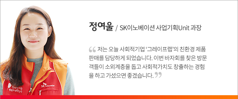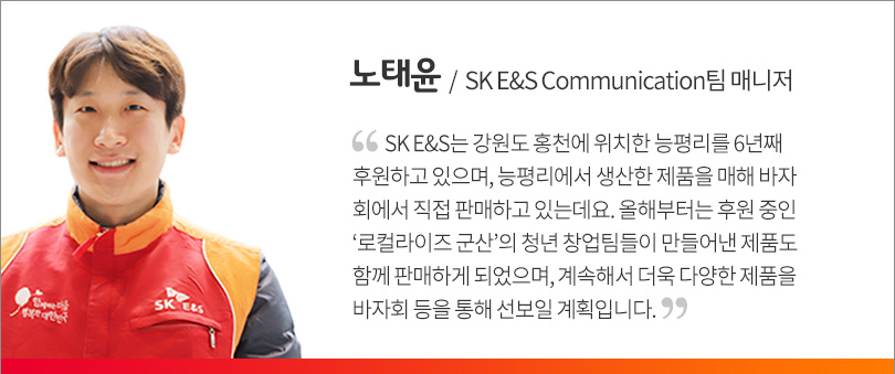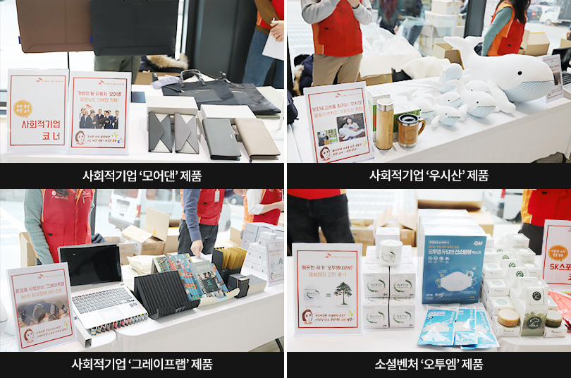 특히, SK이노베이션은 회사가 육성 지원하는 사회적기업 ‘모어댄’의 컨티뉴 가방과 카드지갑, ‘우시산’의 텀블러와 고래인형, ‘그레이프랩’의 북스탠드와 노트북 거치대, ‘맹그러브’의 수제비누 및 소셜벤처 ‘오투엠’의 마스크 등을 판매해 주목을 받았다.