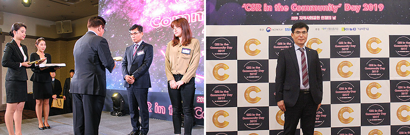 ▲ SK인천석유화학 SV추진 이도원PL이 지난 12월 3일 진행된 ‘2019 지역사회공헌 인정의 날’ 행사에서 인정패 수상(좌측) 후 기념촬영을 하고 있다. (우측)