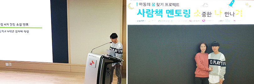 ▲ (좌) SK인천석유화학 ‘사람책 멘토링’ 4기 수료생 인천능내초등학교 6학년 김가예 학생의 소감 발표 / (우) 김가예 학생(오른쪽)이 수료식이 끝난 뒤 기념촬영을 하고 있다.