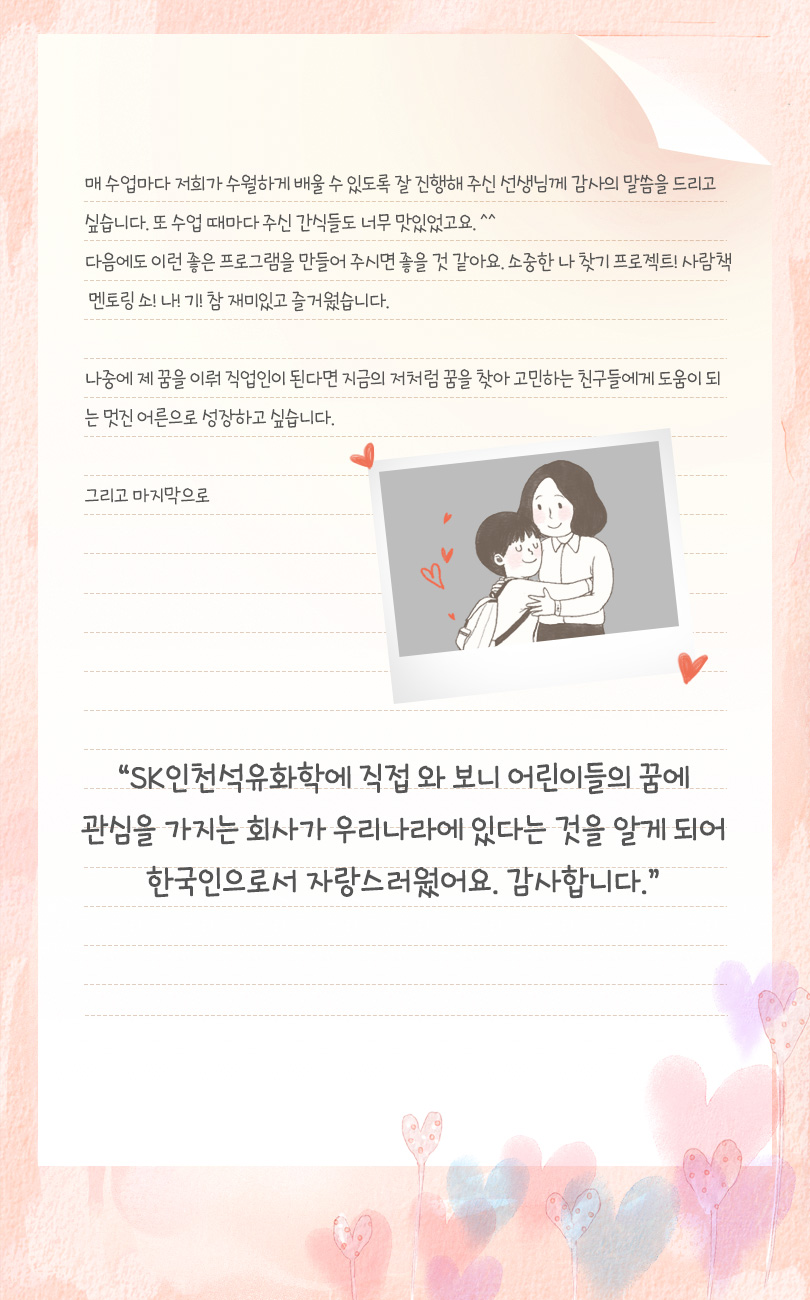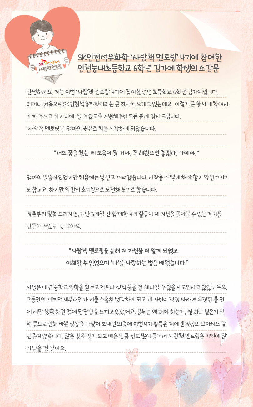 SK인천석유화학의 ‘사람책 멘토링’ 덕분에 자신을 이해하고 더욱 사랑하는 법을 배우게 되었다는 김가예 학생의 소감문을 지금 확인해보자.