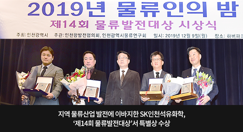 SK인천석유화학은 지난 12월 9일, 인천광역시가 주최하고 (사)인천항발전합의회, (사)인천광역시물류연구회가 공동으로 주관한 ‘2019년 물류인의 밤’ 행사의 일환으로 진행된 제14회 물류발전대상 시상식에서 특별상을 수상했다.