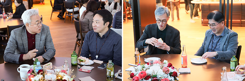 점심시간을 이용해 이바구를 찾은 구성원들은 본격적인 강연에 앞서, 미리 준비된 샌드위치와 김밥 등을 먹으며 35층 곳곳에서 대화를 나눴다. 이 자리에는 SK이노베이션 김준 총괄사장, SK에너지 조경목 사장, SK루브리컨츠 차규탁 사장, SK아이이테크놀로지 노재석 사장이 깜짝 방문해 구성원들과 함께 식사하며 격의 없는 소통의 시간을 가졌다.