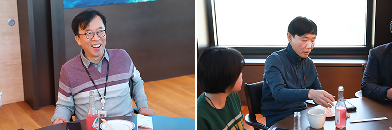 ▲ 구성원들과 함께 식사 중인 SK루브리컨츠 차규탁 사장(좌측 사진)과 SK아이이테크놀로지 노재석 사장(우측 사진 중 가운데)