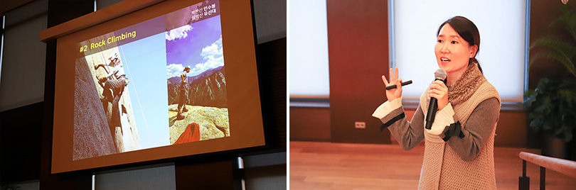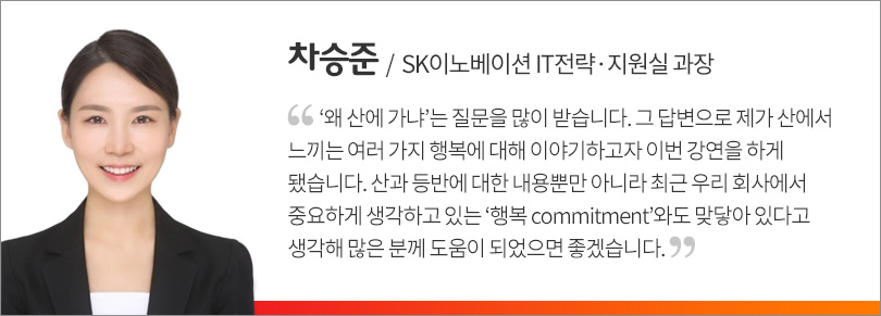 첫 강연자로 나선 SK이노베이션 IT전략·지원실 차승준 과장은 ‘산과 삶이 함께하는 행복 Commitment’를 주제로 이야기를 펼쳐나갔다. TV 프로그램에 나온 페루의 마추픽추를 보기 위해 ‘잉카 트레일’에 도전하게 되면서 등반의 매력에 푹 빠졌다는 차 과장은 트래킹부터 암벽 및 빙벽 등반까지 연달아 도전하며 얻게 된 경험과 행복에 대해 이야기했다.