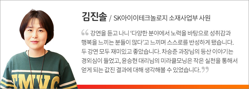 차 과장의 강연이 끝나자 겨울에 가면 좋은 산을 추천해달라는 등 많은 질문이 쏟아졌다. 차 과장은 민주지산과 소백산을 꼽으며 눈꽃과 함께하는 겨울 산행의 즐거움을 많은 분이 알게 되면 좋겠다고 말하는 등 모든 질문에 정성껏 답변했다. 특히, SK이노베이션 김준 총괄사장은 “마추픽추를 시작으로 산의 매력에 빠졌다고 했는데 그게 정확히 언제였냐”고 물었다. 이에 차 과장은 “2014년 크리스마스였다”고 말하며, “매년 크리스마스마다 산행을 하고 있는데 올해 크리스마스에도 산을 오를 계획이다. 큰 사고 없이 다녀올 수 있게 응원해 달라”고 답변해 참석자들의 힘찬 박수를 받았다.