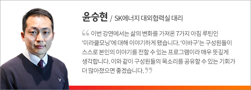 다음으로 마이크를 잡은 SK에너지 대외협력실 윤승현 대리는 ‘미라클모닝으로 시작하는 행복 Commitment’를 주제로 일찍 일어나는 삶과 주체적인 행복에 대해 이야기했다.