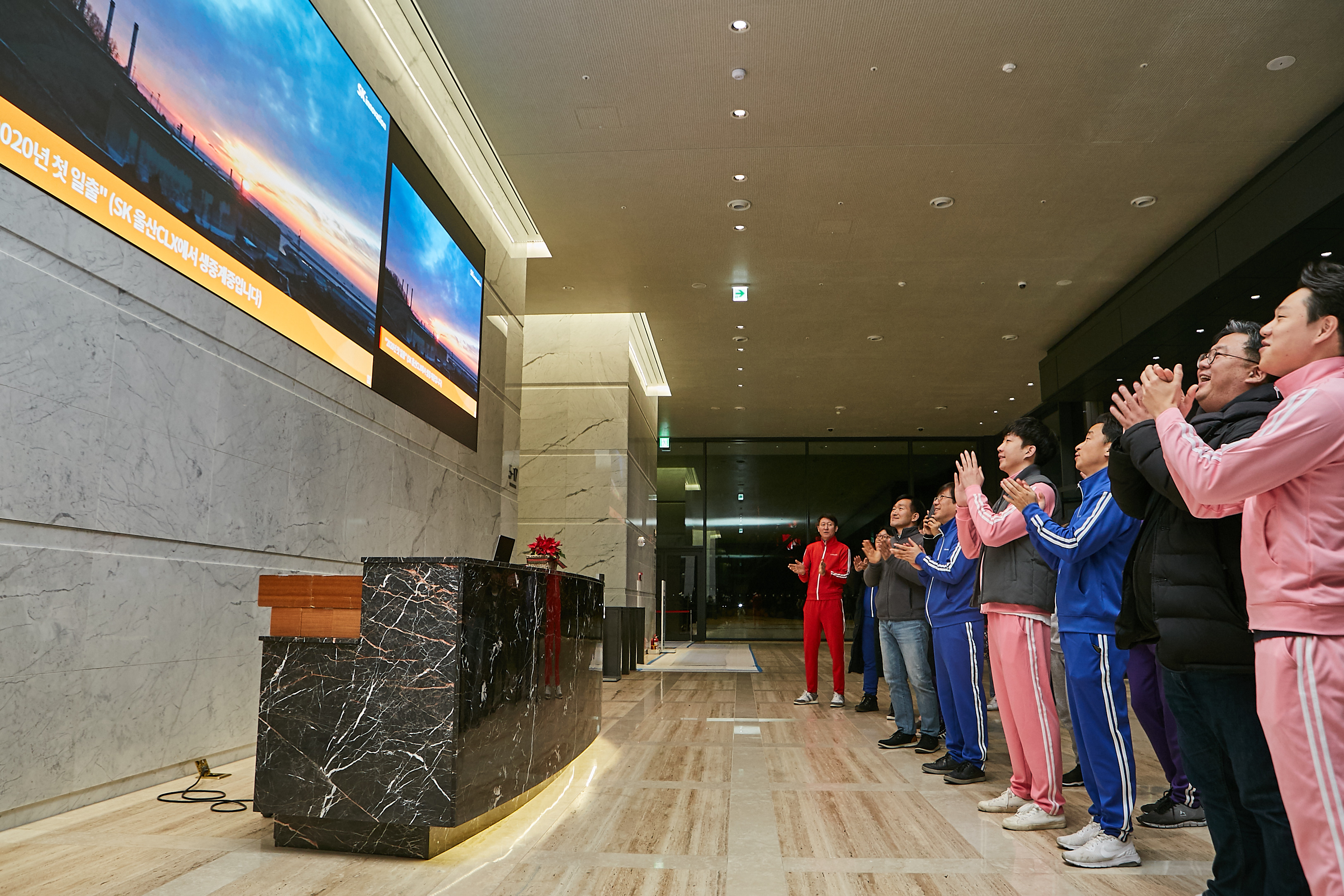 사진1-5: SK이노베이션 구성원들이 SK서린사옥 1층 로비에 모여 대형 미디어월로 SK울산Complex 신년 해맞이를 보고 있다