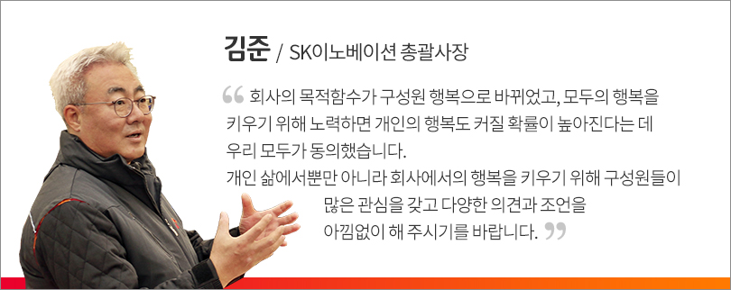 이날 행복토크에 함께 한 김준 총괄사장과 SK인천석유화학 최윤석 사장을 비롯한 구성원들은 “SK이노베이션 계열 전체가 친환경 사회적가치 창출을 통한 성장전략인 ‘그린밸런스 2030’과 ‘구성원 행복추구’ 모두를 독하게 해내자”는 다짐도 잊지 않았다.