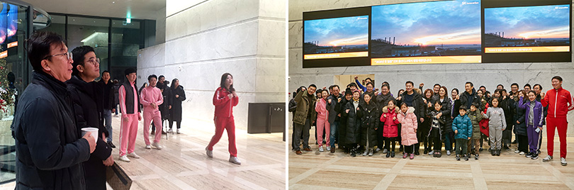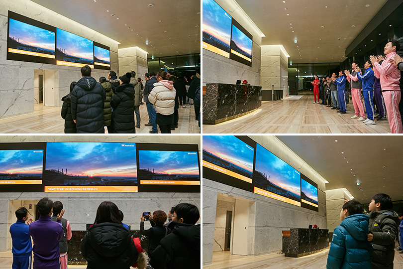 ▲ SK이노베이션 계열 구성원 및 가족들이 SK서린사옥 1층 미디어월에서 일출 생중계를 감상하고 있다.