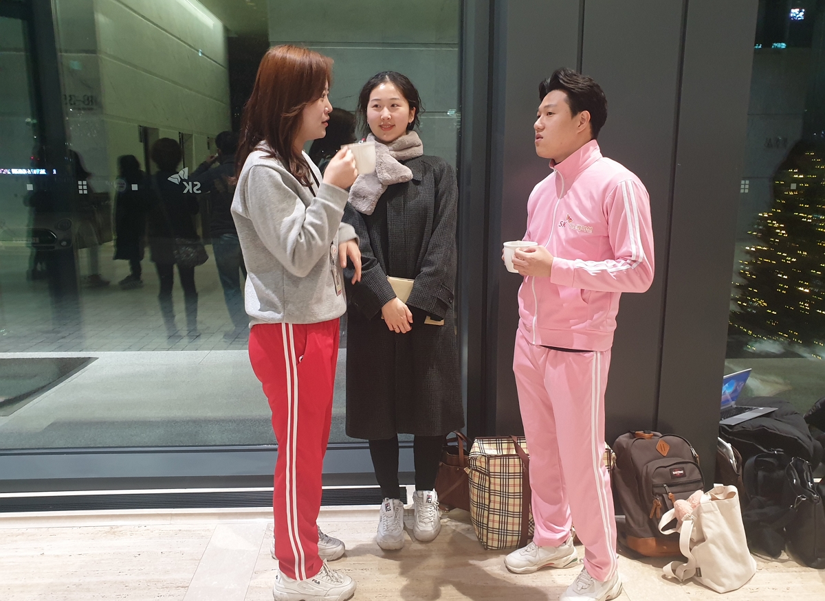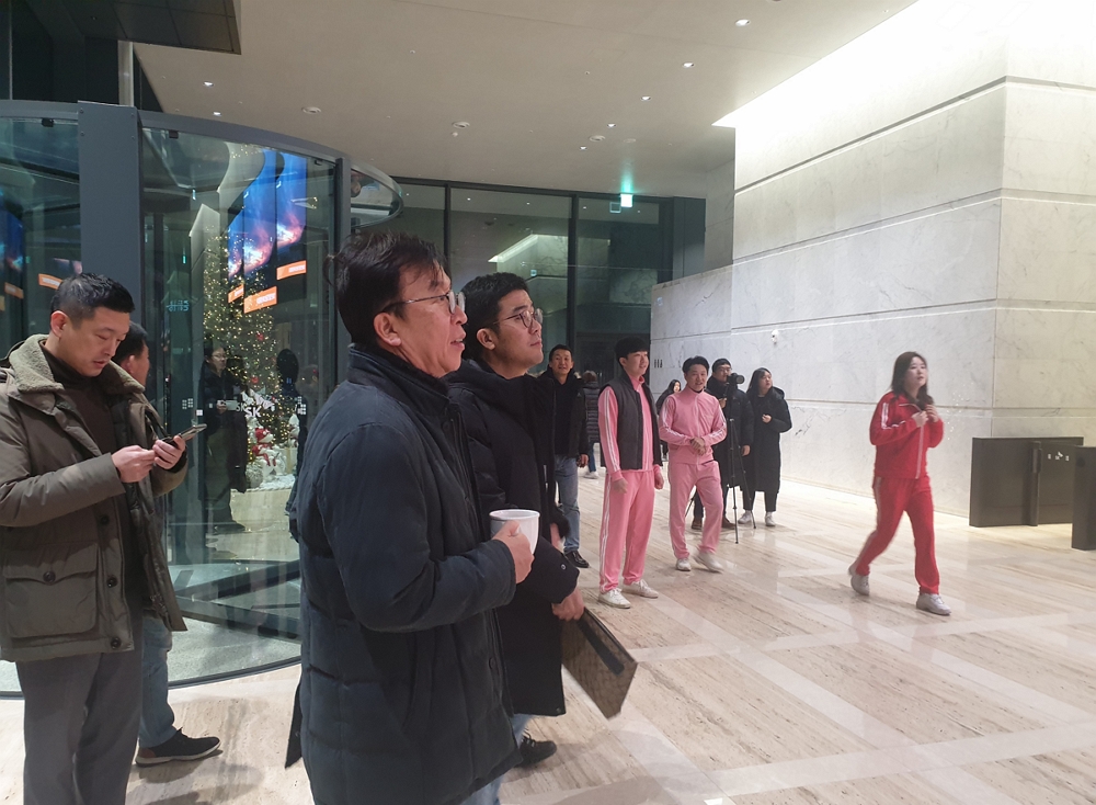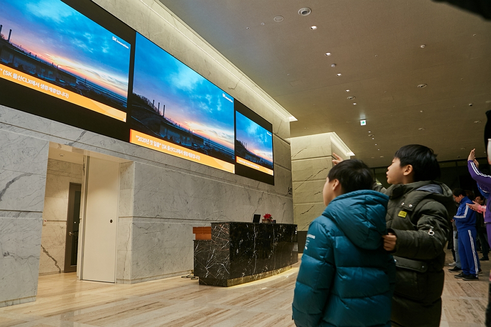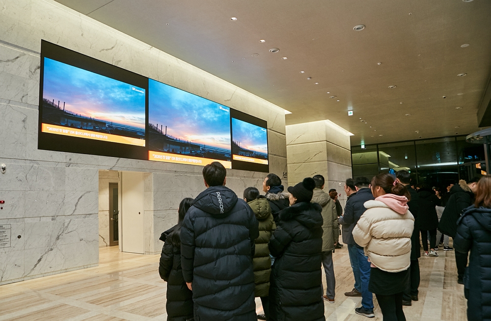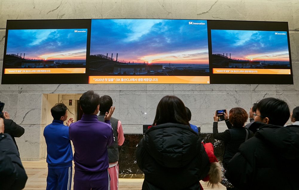 ▲ SK이노베이션 계열 구성원 및 가족들이 SK서린사옥 1층 미디어월에서 일출 생중계를 감상하고 있다.