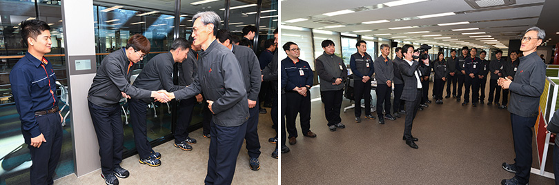▲ SK에너지 조경목 사장이 지난 12월 31일, SK 울산Complex를 방문해 구성원들을 격려하고 있다.