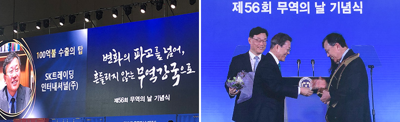 ▲ (우측) 지난 12월, ‘제56회 무역의 날’ 기념식에서 문재인 대통령(왼쪽)으로부터 ‘100억불 수출의 탑’을 수상하고 있는 SK트레이딩인터내셔널 서석원 사장(오른쪽)