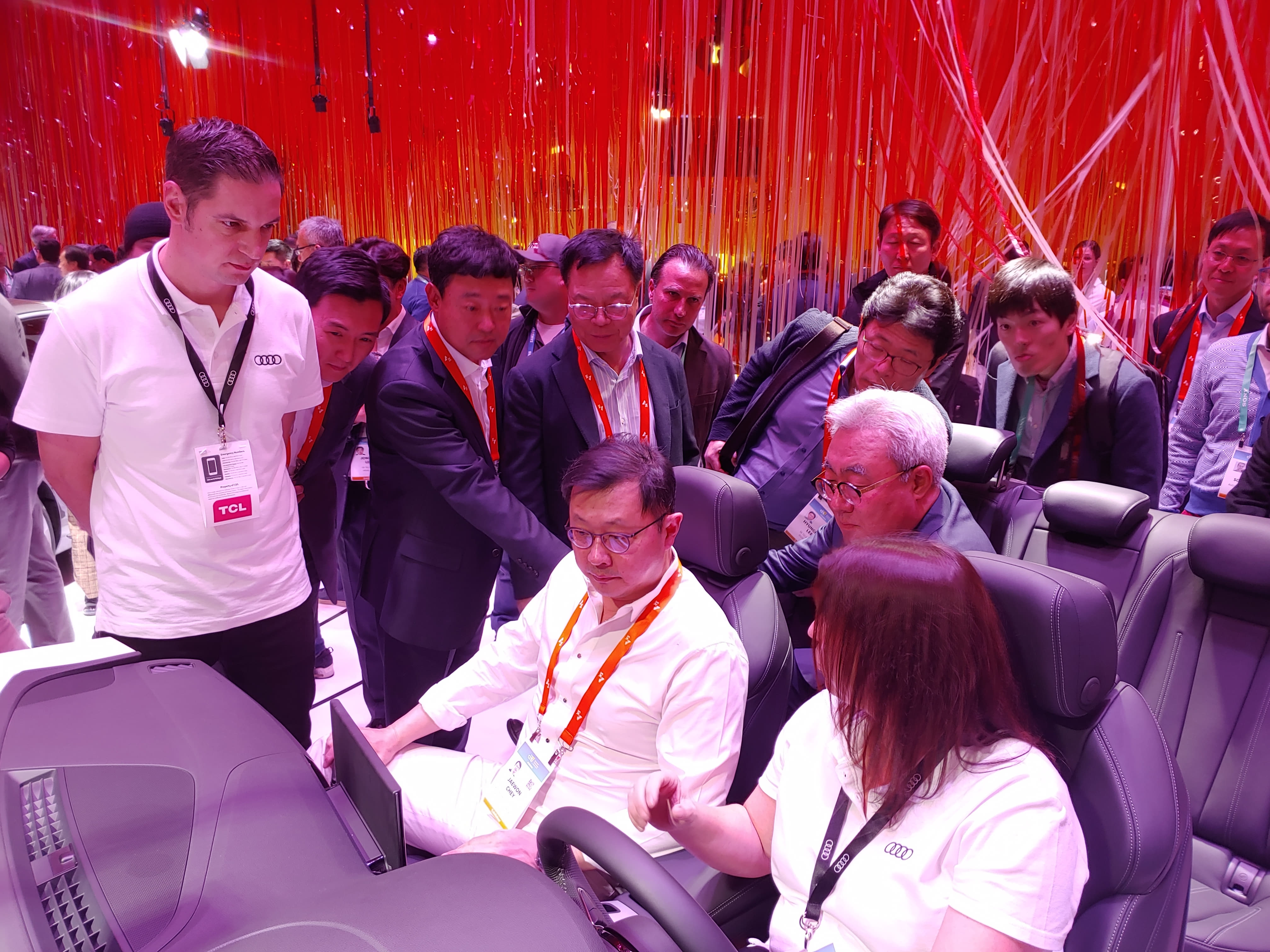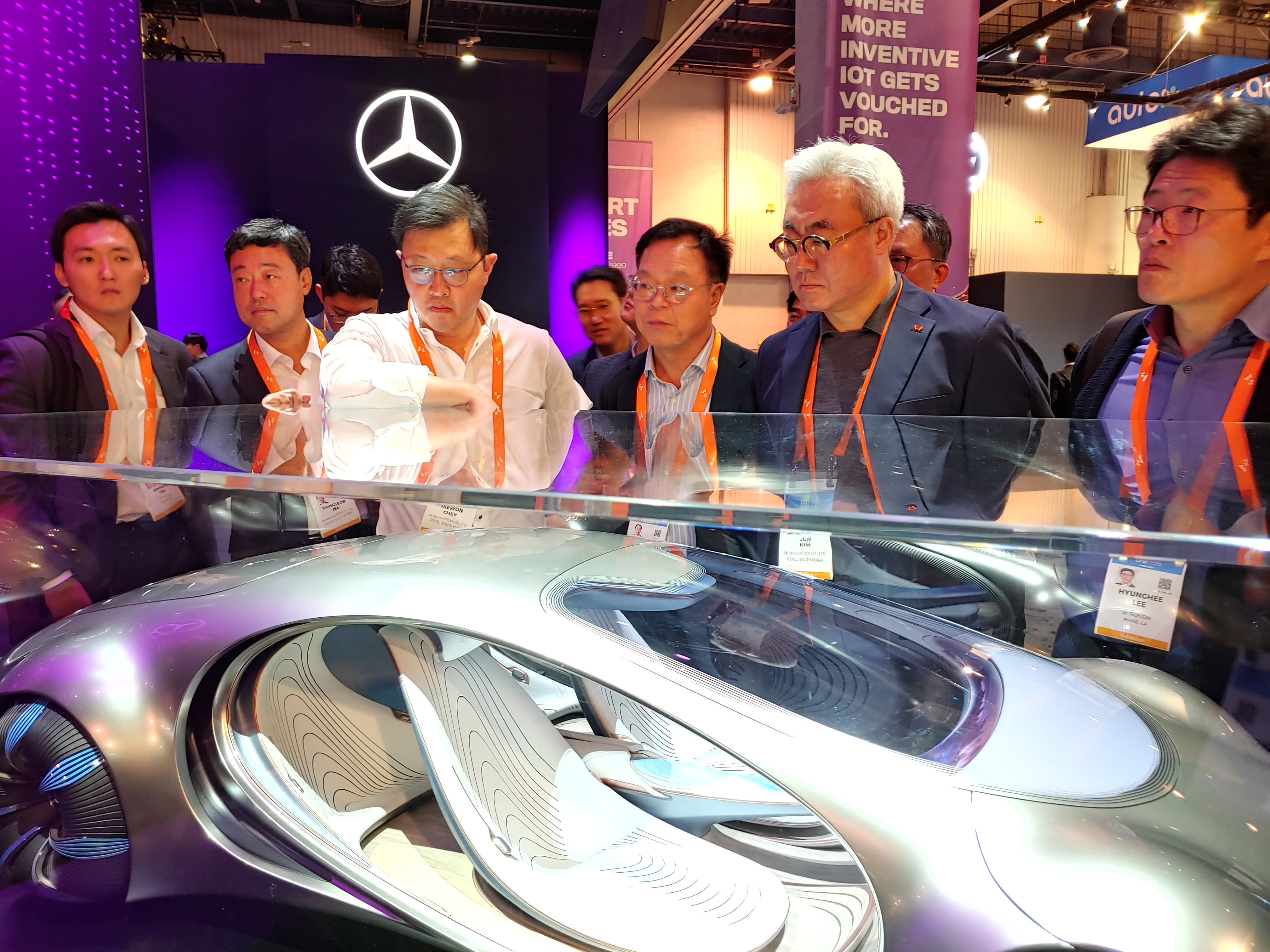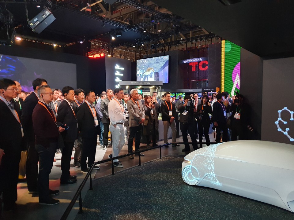 ▲ ‘CES 2020’에 참가한 글로벌 완성차 업체의 부스를 둘러보고 있는 SK그룹 최재원 수석 부회장(왼쪽에서 세 번째)과 SK이노베이션 김준 총괄사장(왼쪽에서 다섯 번째)