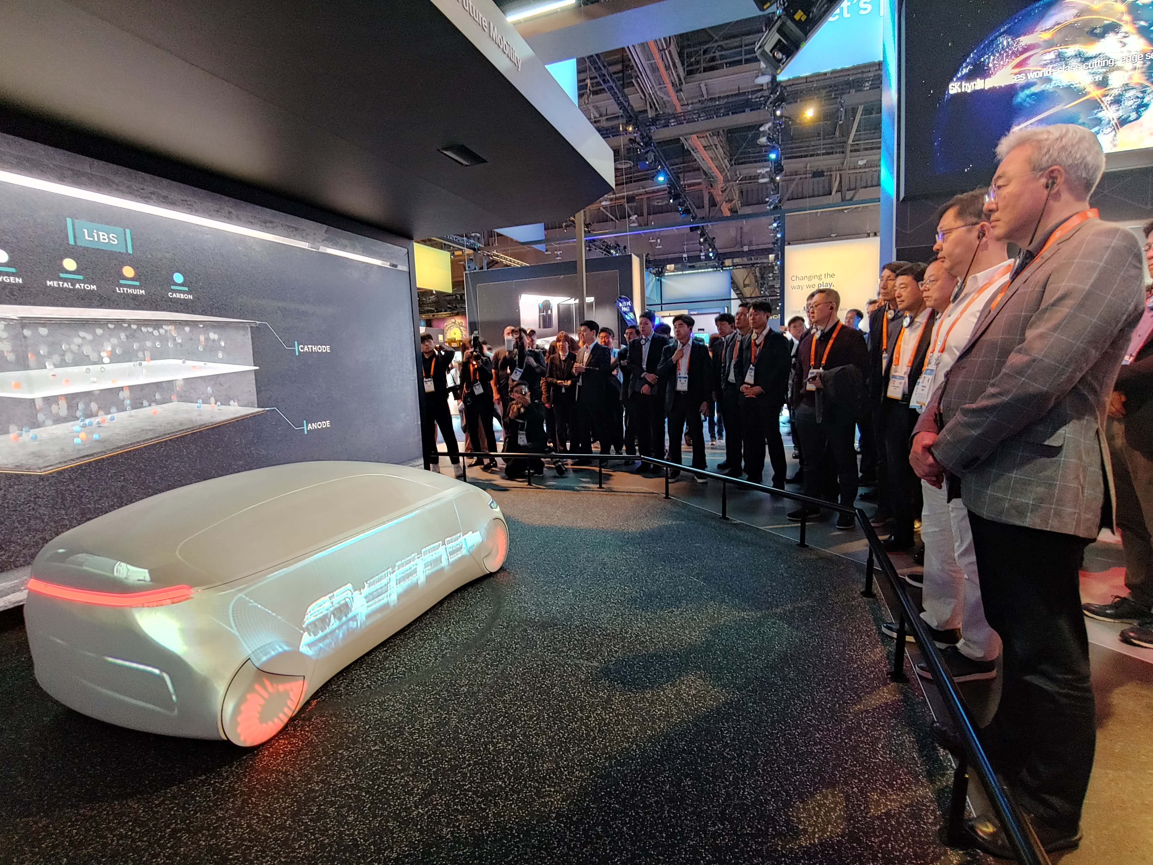 ▲ ‘CES 2020’에 참가한 SK 부스를 방문해 전시물을 살펴보고 있는 SK그룹 최재원 수석 부회장과 SK이노베이션 김준 총괄사장(중앙)