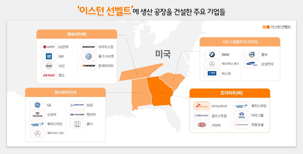 조지아주는 테네시, 앨라배마, 사우스캐롤라이나 등 남동부 공업지구를 지칭하는 이스턴 선벨트(Eastern Sunbelt) 지역에 속해 있다. 이 지역은 폴크스바겐, BMW, 다임러, 현대∙기아차가 집결한 글로벌 완성차 업체들의 미국 최대 생산 거점으로 평가 받는다.