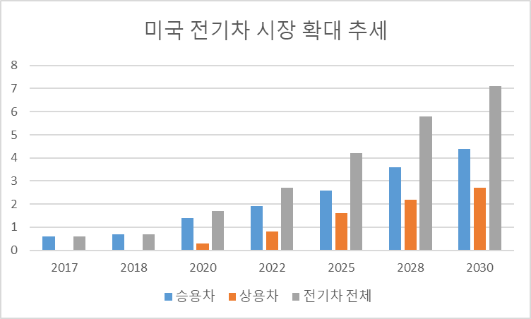 최근 미국 전기차 시장 확대는 이러한 기대감을 더욱 높이고 있다. SNE리서치에 따르면 올해 170만대 수준인 미국 전기차 시장 규모는 매년 17%씩 성장해 2030년 700만대 이상이 될 것으로 전망하고 있다. 글로벌 전기차 시장 규모가 올해 612만대에서 2025년 2,213만대로 확대될 전망인 것을 고려하면 매우 빠른 속도로 성장 중이다.