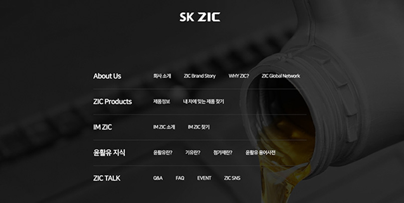 새롭게 개편된 SK 지크 브랜드 사이트(http:⁄⁄skzic.com)는 ▲회사 및 브랜드 소개를 담은 ’About Us’, ▲SK 지크 제품을 다룬 ’ZIC Products’, ▲전국에 위치한 SK 지크 매장을 찾을 수 있는 ’IM ZIC’, ▲윤활유 관련 상식을 알 수 있는 ’윤활유 지식’, ▲소비자와 양방향으로 소통하기 위한 ’ZIC TALK’ 등 5개 카테고리와 16개의 세부 메뉴로 구성되어 있으며, 이를 통해 다양한 콘텐츠를 제공한다.