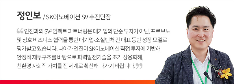 SK이노베이션의 투자가 관심을 끄는 이유는 SK그룹의 에너지·화학 및 신에너지 분야를 담당하고 있는 중간지주회사가 직접 투자를 통해 소셜벤처의 성장을 지원한다는 점이다. 이번에 투자를 받은 인진은 파력발전기술 중 가격 경쟁력이 높은 Onshore(1) 방식의 기술을 보유한 글로벌 선도기업이다. 글로벌 파력발전업체 3백여 개사 중 약 1%만이 달성한 상용화 근접 단계 기술을 보유하고 있으며, 연내 상용화를 추진 중이다.
