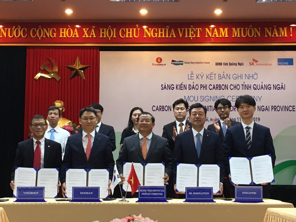 ▲ 지난 해 11월 진행된 베트남 안빈(An Binh)섬 ‘탄소제로섬(Carbon Free Island) 프로젝트’ MOU 체결 현장. 사진 왼쪽부터 빈그룹 보광훼 부사장, 두산중공업 정연인 대표이사, 응원땅빈 꽝응아이성 인민위원회 부위원장, SK이노베이션 지동섭 배터리사업 대표, 인진 성용준 대표.