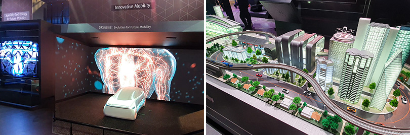 ▲ SK이노베이션이 CES 2020에서 선보인 (좌)미래 모빌리티를 위한 진화(Evolution for Future Mobility), (우)디오라마 E-모빌리티의 시대(The age of E-Mobility)