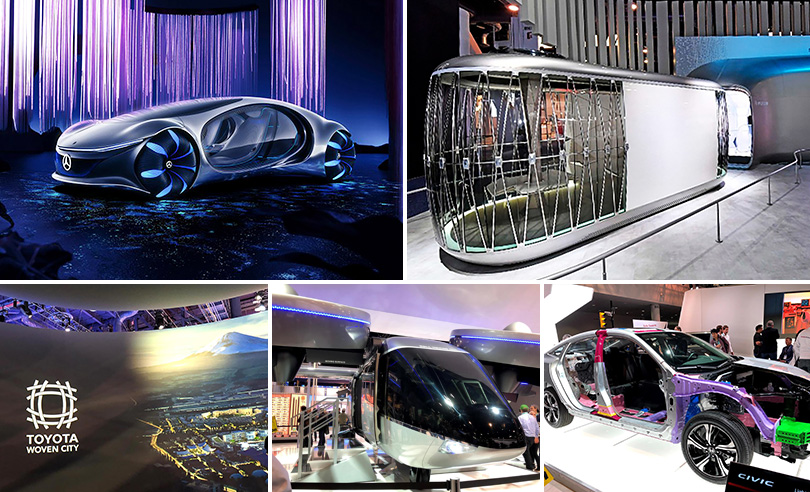 ▲ 좌측 상단 첫번째부터 시계방향으로)다임러 메르세데스 벤츠의 비전 AVTR, 현대자동차의 PBV, 혼다의 Civic Lightweight, 벨의 Flying Taxi, 토요타의 Woven City *