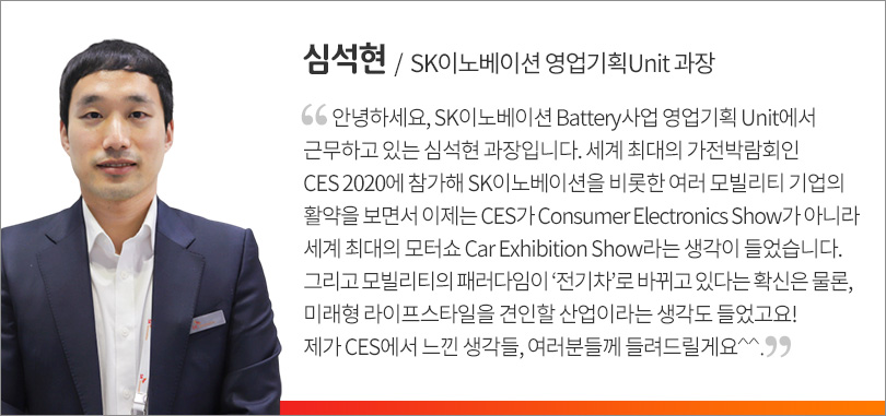 SK이노베이션은 이번 CES 2020에서 배터리뿐만 아니라 SK루브리컨츠의 전기차용 윤활유, SK종합화학의 초경량소재, SK아이이테크놀로지의 Flexible Cover Window등을 소개했습니다. 그리고 이들이 모두 완성형으로서 모빌리티 사용자의 눈에 보이지는 않지만 전체를 이루는 핵심들이라는 의미에서 ‘SK Inside’라는 컨셉을 발표했습니다.