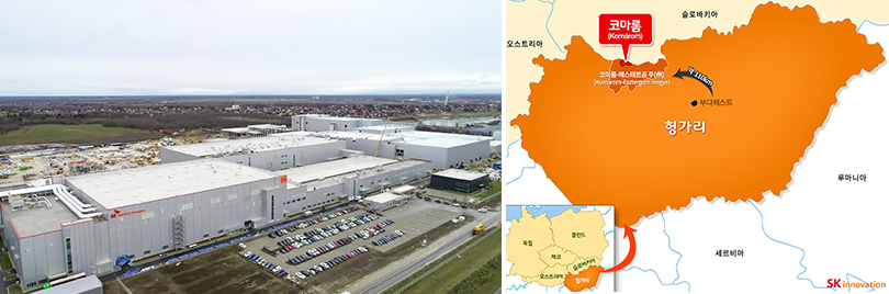 ▲ SK이노베이션 헝가리 공장(좌)과 공장이 위치한 코마롬의 위치를 표시한 지도(우)