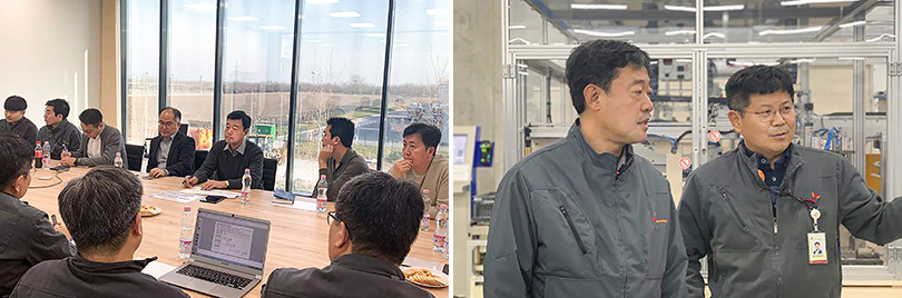 ▲ SK이노베이션 지동섭 배터리 사업 대표가 헝가리 배터리 1공장을 방문해 현황 등에 대해 구성원들과 회의하고 있다.