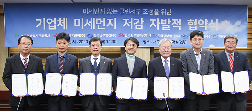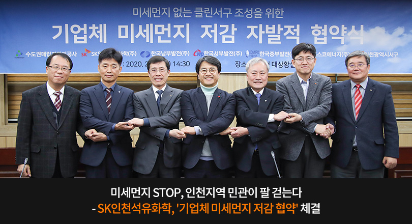 SK인척석유화학은 18일 인천 서구청 대회의실에서 인천 서구 등 6개 기관과 ‘기업체 미세먼지 저감을 위한 자발적 협약’을 체결했다. 이번 협약은 공사를 비롯한 인천 서구에 위치한 6개 기업이 서구와 협력해 2022년까지 미세먼지와 황·질소산화물 등 대기오염물질을 참여기업 총 배출할당량의 20% 이상을 자발적으로 줄이는 것을 목표로 한다.