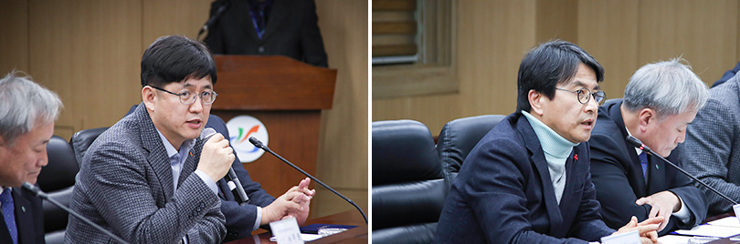 ▲SK인천석유화학 이효진 실장(좌)과 이재현 인천서구청장이 ‘미세먼지 저감을 위한 자발적 협약식’에서 이야기하고 있다.