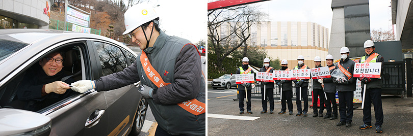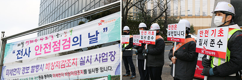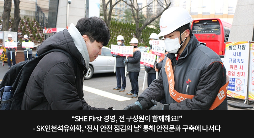 ▲ SK인천석유화학 구성원이 회사 정문에서 ‘안전 점검의 날’ 캠페인을 안내하고 있다.