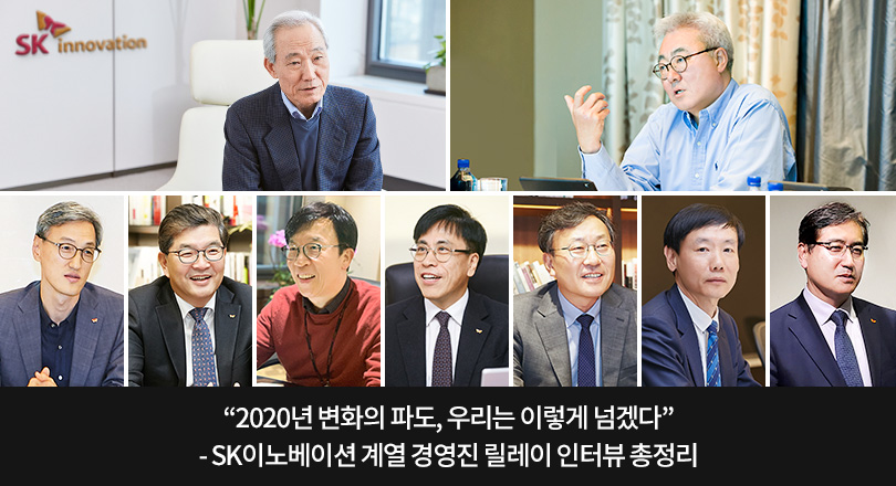 SK이노베이션이 만든 뉴스 전문채널인 SKinnonews.com은 지난 1월 28일부터 2월 24일까지, 총 아홉 명의 SK이노베이션 계열 경영진(이하 경영진)과의 인터뷰를 통해 ‘미리 보는 SK이노베이션의 2020년’을 연재했다. 경영진은 높아진 불확실성 속에 올해 경영환경이 결코 녹록지 않을 것이라 예상했지만, 오히려 이러한 어려움을 딥체인지의 속도를 높이는 새로운 기회로 삼겠다고 입을 모았다. 또, 전 구성원과 함께 한다면 충분히 가능할 것이라는 의지를 보였다. 2020년 변화의 파도를 맞이하고 있는 SK이노베이션 구성원들과 함께 어떠한 어려움도 넘어설 수 있다는 경영진, SKinno News가 경영진 릴레이 인터뷰를 총정리 해 보았다. 앞으로 SKinno News는 새로운 인터뷰 시리즈로 SKinno News 독자를 찾아갈 예정이다.