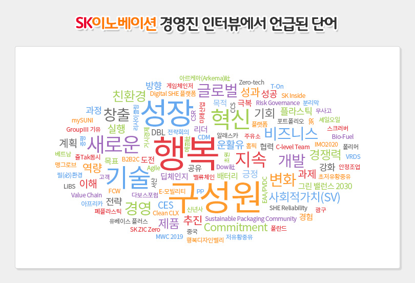 이와 더불어 ‘사회적가치’와 ‘친환경’도 각각 26회, 25회 언급돼 경영진이 경제적 가치와 사회적가치를 동시에 추구하는 DBL(Double Bottom Line)* 전략은 물론, SK이노베이션 계열의 비전인 ‘그린밸런스 2030’ 추진에 대한 구체적인 청사진들이 제시됐다.