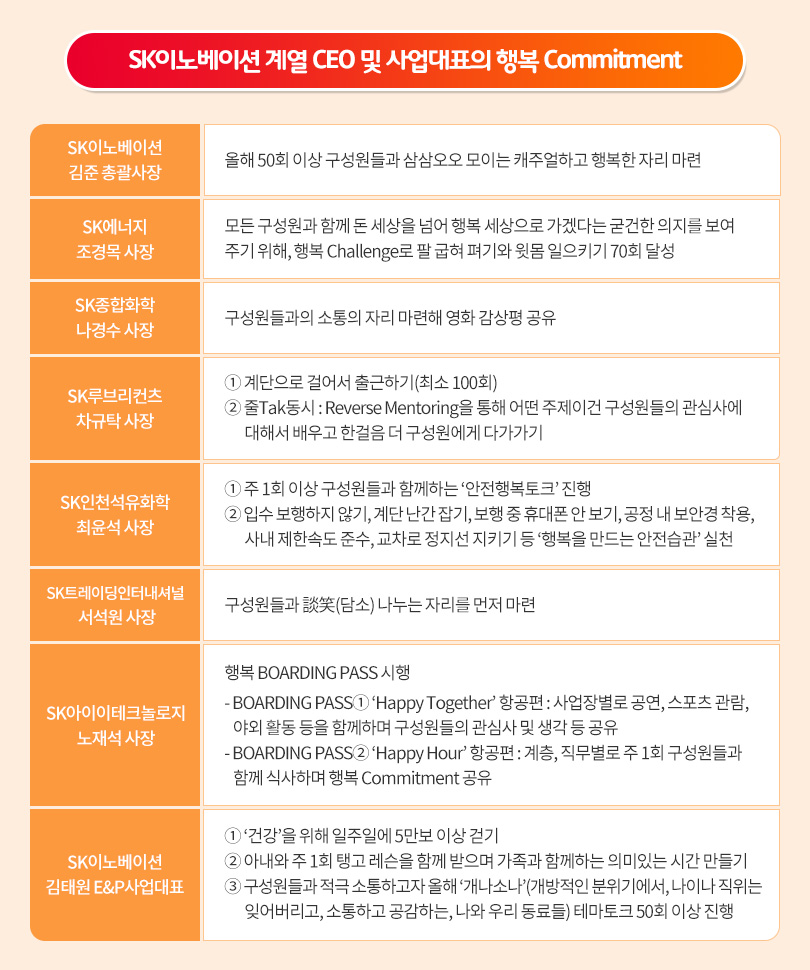 이를 위해 김준 총괄사장을 비롯한 경영진은 연초부터 구성원들과 보다 가까이에서 소통할 수 있는 자리를 수시로 마련해 행복에 대한 서로의 생각을 공유, 공감하는 시간을 가졌다.
