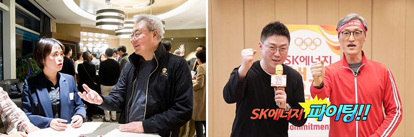 ▲ (좌) SK이노베이션 김준 총괄사장이 CES 2020 현장에서 구성원들과 행복 Commitment를 나누고 있다. / (우) SK에너지 조경목 사장이 행복 Commitment인 ‘행복 Challenge’를 진행하고 있다.